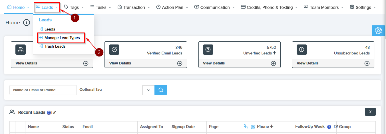 2. Then from the drop-down menu, select "Manage Lead Types".