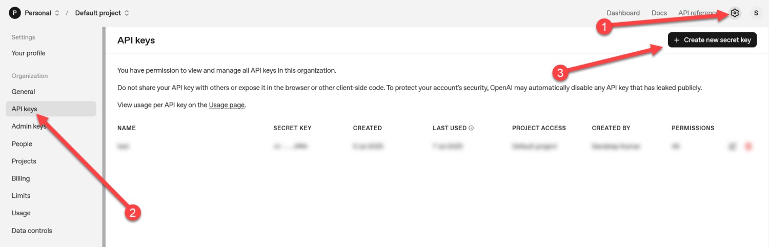 1) In your openAI account Click on Settings icon > API Keys.